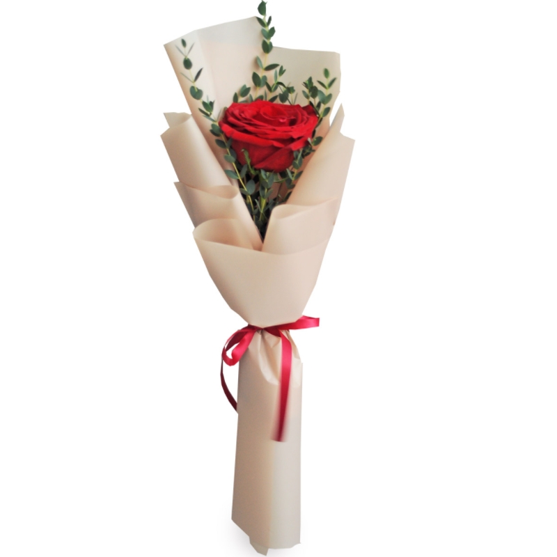 Букет состоит из 1 красная роза, зелень, крафт, атласная лента.